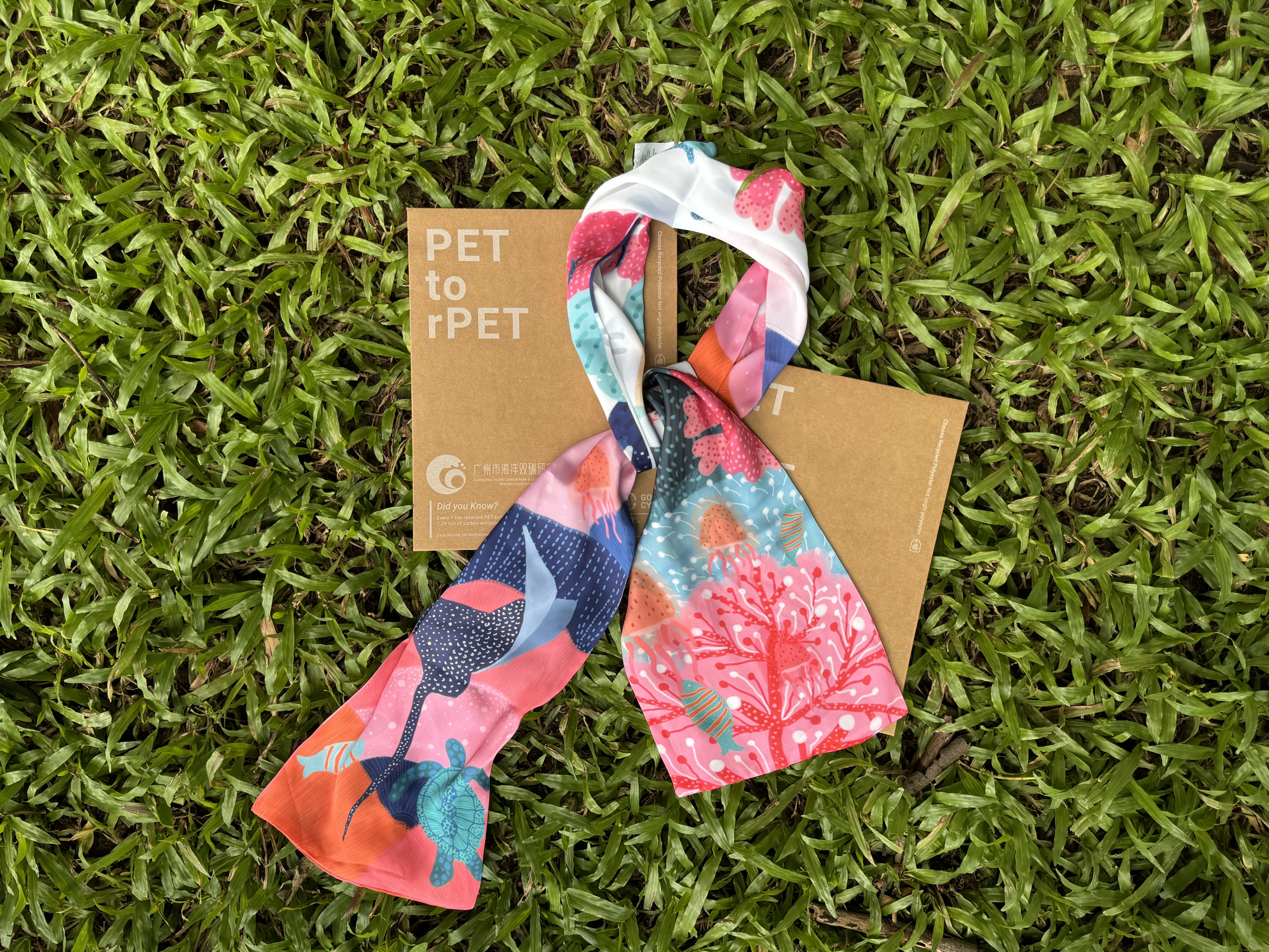 2024年7月,生态环境部副部长郭芳在国新办新闻发布会上介绍美丽海湾建设成就时,就向大众展示了一条绘有热带鱼、珊瑚、水母的丝巾,并介绍道:“它由三个废弃塑料瓶制成,塑料瓶全部来自南沙公益净滩活动。”